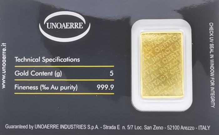 Lingottino UNOAERRE in oro puro 999% da 5 grammi per investimento... ideale come regalo per battesimo, comunione o cresima.