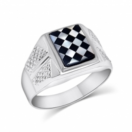 Anello scudo da uomo in oro bianco 18kt con inserti in onice e madreperla