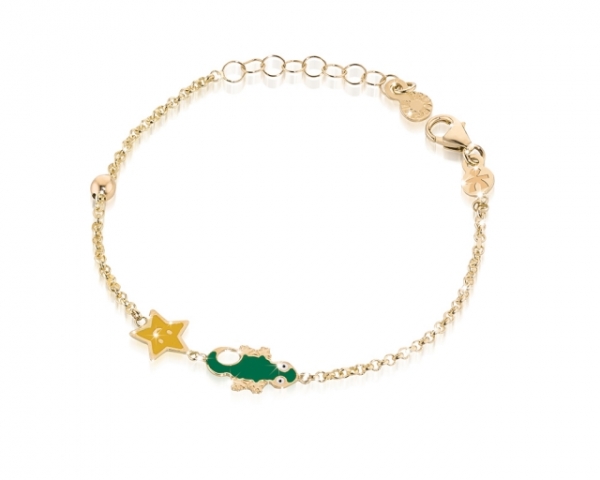 Bracciale Le Bebè - Primegioie - collezione "fortuna" stellina e geco con smalto colorato in oro giallo 9kt adatto ai maschietti.