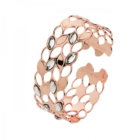 Bracciale BOCCADAMO rigido a fascia in bronzo placcato oro rosa (diametro cm 6), con decoro a spighe di grano e cristalli Swarovski crystal (altezza cm 2).