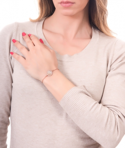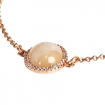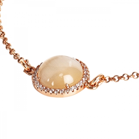 Bracciale BOCCADAMO Sharada in bronzo placcato oro rosa con cristallo cabochon centrale beige gatteggiante e zirconi (diametro cm 1,5). Lunghezza cm 16,5, estendibile fino a cm 19,5.
