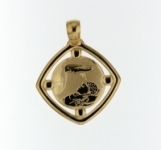 Medaglia di forma romboidale traforata in oro giallo 18kt con immagine della Fonte Battesimale incisa di finitura lucida e satinata.