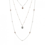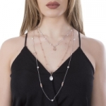 Collana BOCCADAMO multifilo in bronzo rodiato e placcato oro rosa con perle bianche Swarovski (diametro mm 4 e mm 6), medagliette Sacre (dimensione mm 12x8; mm 15x10) e sfere diamantate placcate oro rosa (diametro mm 6). Lunghezza filo più corto cm 45; lunghezza filo più lungo cm 90 e allungamento di cm 5,5.
