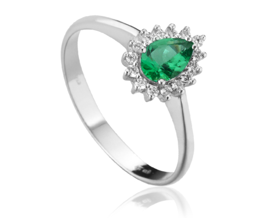 Anello Roger Gems con Smeraldo Naturale a goccia da 0.40ct e contorno di Diamanti da 0.11ct totali su montatura in oro bianco 18kt.