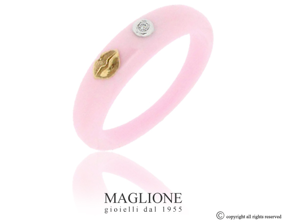 Anello Dalù in ceramica con colore a scelta, bacio in oro bianco o giallo 18kt e diamante naturale