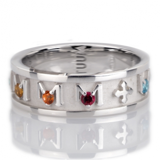 L'anello DECEM è caratterizzato da 10 M dell'Ave Maria con incastonati 10 Topazi colorati nei grani, così da poterlo utilizzare anche quando si recita la Santa preghiera del Rosario.