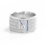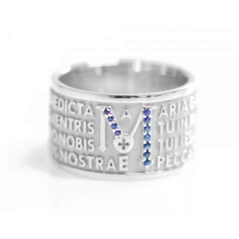 Anello Tuum Animae Mater in Argento 925 Rodiato e Zaffiri blu con Ave Maria in latino.