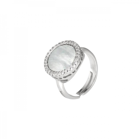 Anello BOCCADAMO Orbiter in bronzo rodiato con centrale in madreperla e zirconi laterali (diametro cm 1,5).
