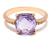 Anello da donna in oro rosa 18kt con pietra viola centrale e serie di pietre sintetiche taglio brillante incastonate lungo i lati. Il numero dell'anello è 15,5 (con misuratore UNOAERRE, corrispondente ad un diametro interno di 17,60mm) ma è possibile farlo portare ad un'altra misura da un qualsiasi gioielliere o rivolgendoti a noi con un'attesa di 5 giorni lavorativi. Gioiello Made in Italy completo di confezione regalo.