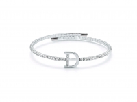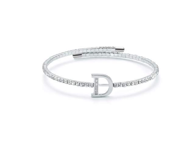 Bracciale KIARA con lettera D e zirconi collezione Basik Chic. Il bracciale è semirigido con in ottone placcato oro bianco. Il marchio KIARA è la bijutteria in ottone anallergico del gruppo Cielo Venezia 1270, produttrice dei famosissimi gioielli MILUNA. Gioiello completo di confezione regalo, shopper e certificato di garanzia.
