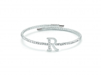 Bracciale KIARA con lettera R e zirconi collezione Basik Chic. Il bracciale è semirigido con in ottone placcato oro bianco. Il marchio KIARA è la bijutteria in ottone anallergico del gruppo Cielo Venezia 1270, produttrice dei famosissimi gioielli MILUNA. Gioiello completo di confezione regalo, shopper e certificato di garanzia.