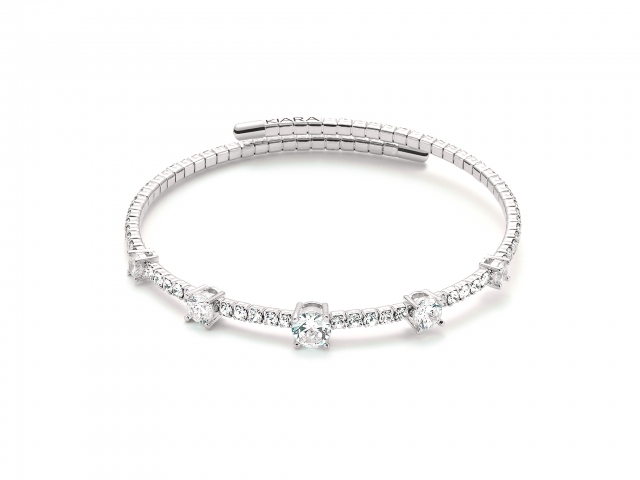 Bracciale KIARA con Punti Luce e zirconi collezione Basik Chic. Il bracciale è semirigido con in ottone placcato oro bianco. Il marchio KIARA è la bijutteria in ottone anallergico del gruppo Cielo Venezia 1270, produttrice dei famosissimi gioielli MILUNA. Gioiello completo di confezione regalo, shopper e certificato di garanzia.