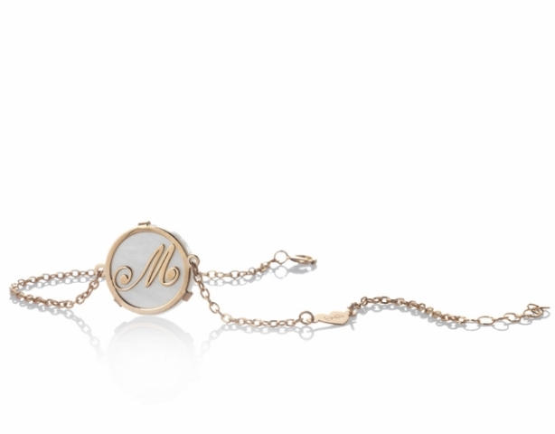 Bracciale con ciondolo personalizzabile con iniziale del nome in oro giallo o rosa 18kt e madreperla.
