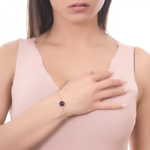 Bracciale BOCCADAMO Sharada in bronzo placcato oro giallo con elementi circolari di zirconi e cristallo cabochon centrale color ametista gatteggiante su base di zirconi. Lunghezza cm 17, estendibile fino a cm 20.