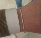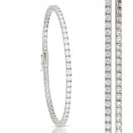 Bracciale Tennis Donna, snodato semirigido, realizzato in oro bianco 18kt con chiusura a cassetta e aletta di sicurezza da 18 cm di lunghezza e 3 mm di larghezza.