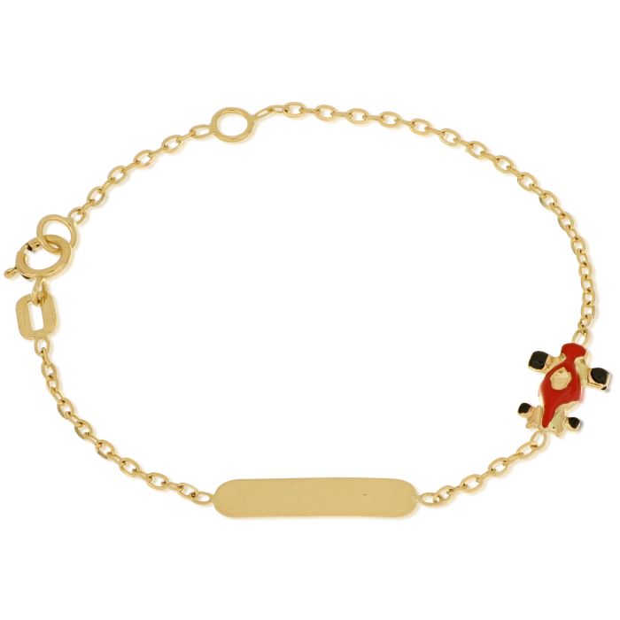 Bracciale battesimale da bambino con targhetta personalizzabile e auto F1 smaltata in oro giallo 18kt