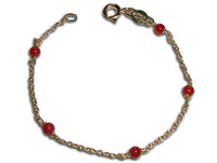 Bracciale da bimba a cetenella in oro giallo 18kt con 5 corallini rossi portafortuna.
