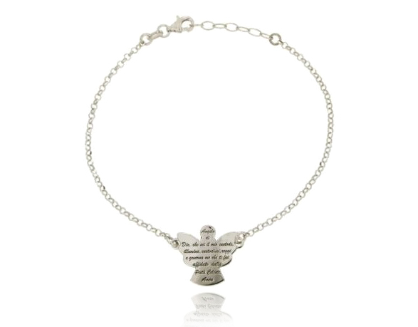 Il bracciale è realizzato con una maglia rolò diamantata, l'Angelo ha invece una lavorazione lucida e da un lato è incisa la preghiera dell'Angelo di Dio.