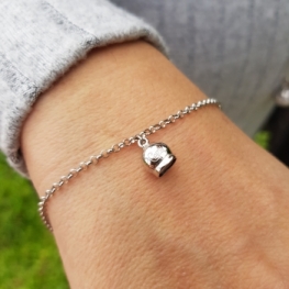 Il bracciale è a maglia rolò, regolabile dai 17 ai 20 cm, con la campanella al centro di 0,80 x 0,80 cm.