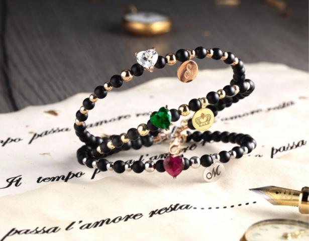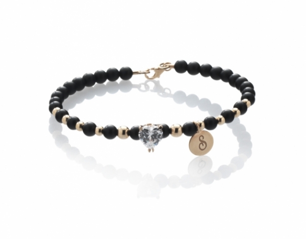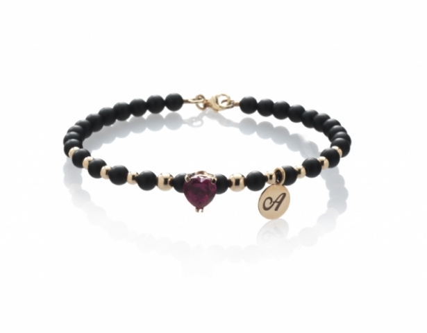 Bracciale DaLù collezione SAN VALENTINO semi rigido in onice zircone e oro 18kt personalizzabile con iniziale del nome. Il bracciale ha un anima interna in titanio che lo rende flessibile ma al tempo stesso molto resistente. Le sfere di onice sono satinate per renderlo più chic. Gli inserti in sfera, così come la chiusura e la targhetta personalizzabile con iniziale del nome, sono tutti in oro giallo 18kt mentre il cuore è uno zircone bianco, rosso e verde... si prega di selezionare la scelta del colore nel menù a tendina posto sopra al pulsante "Aggiungi al carrello". L'iniziale da incidere sulla targhetta è da comunicare nel campo "Richieste? Personalizzazioni?" del carrello. Gioiello Made in Italy accompagnato da garanzia e confezione regalo originale Dalù!