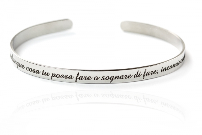 Bracciale Unisex in acciaio con frase incisa Qualunque cosa tu possa fare o pensare di fare, incominciala