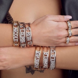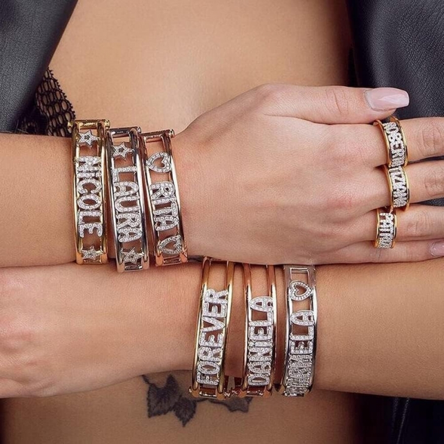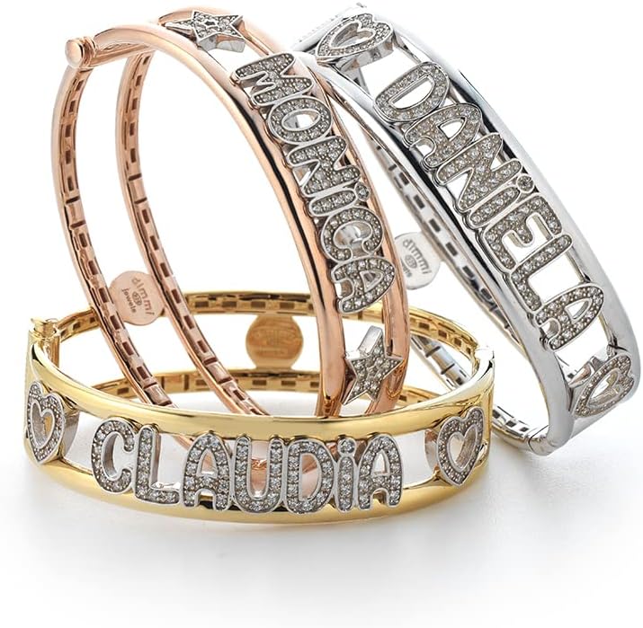 Bracciale Dimmi Jewels a manetta rigida personalizzabile con nome a scelta realizzato a mano in argento 925 rodiato bianco, placcato oro giallo oppure placcato oro rosa con lettere in Zirconi taglio brillante.