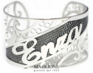 Bracciale a schiava, realizzato in acciaio anallergico 316L bianco, base trasversale con Swarovski originali neri e nome personalizzabile. Questi bracciali non vanno indossati al polso in quanto molto larghi, ma portati sopra i maglioni d'inverno o sul braccio d'estate... in ogni caso la lunghezza del bracciale può essere regolata, da un diametro minimo di 6 cm fino ad un massimo di 7 cm. Il taglio del nome e dei trafori del bracciale viene effettuato a laser con macchinari ad altissima precisione! La pulizia del taglio, la bellezza del carattere e la rifinitura, sono quindi impeccabili. Il nome è richiedere direttamente nelle note del carrello. Realizzato esclusivamente su ordinazione, pertanto non è possibile spedirlo prima di 7 giorni lavorativi. Gioiello Made in Italy completo di confezione regalo.