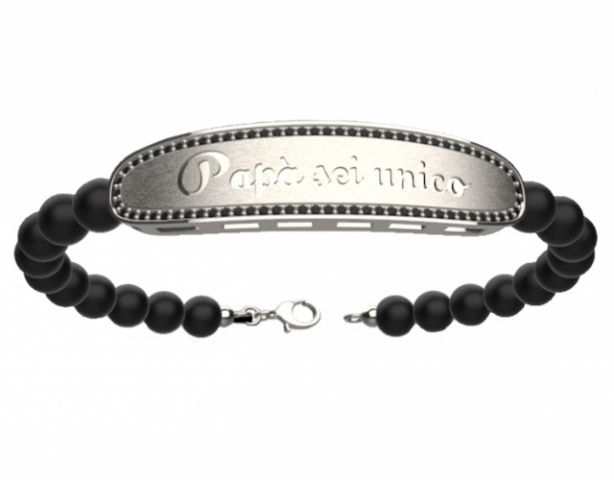Il bracciale è composto da 20 sfere di Onice satinato ed una piastra centrale in argento 925% satinato, lunga 5 cm e larga 1.10 cm, con già incisa a laser la frase "Papà sei unico" contornata da una serie di zirconi neri taglio brillante a rendere più prezioso e luminoso il bracciale.