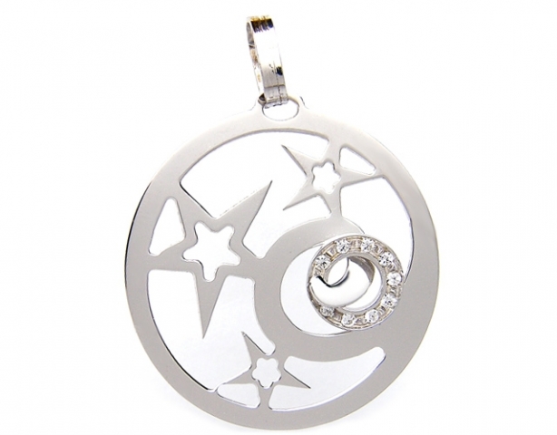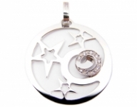 Particolare ciondolo tondo completamente in oro bianco 18kt con 3 stelle traforate cerchio con pavè di zirconi.
