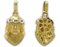 Realismo e perfezione in questo ciondolo raffigurante il Volto di Gesù realizzato con l'alternanza della lavorazione satinata a quella lucida; il retro del ciondolo è molto particolare in quanto tutto traforato (visibile nella seconda foto). Il ciondolo è tutto realizzato in oro giallo 18kt tranne la corona di spine realizzata in oro bianco 18kt.