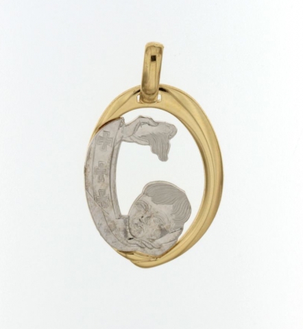 Medaglia di forma ovale traforata in oro giallo e bianco 18kt con immagine della Fonte Battesimale incisa di finitura lucida e satinata.