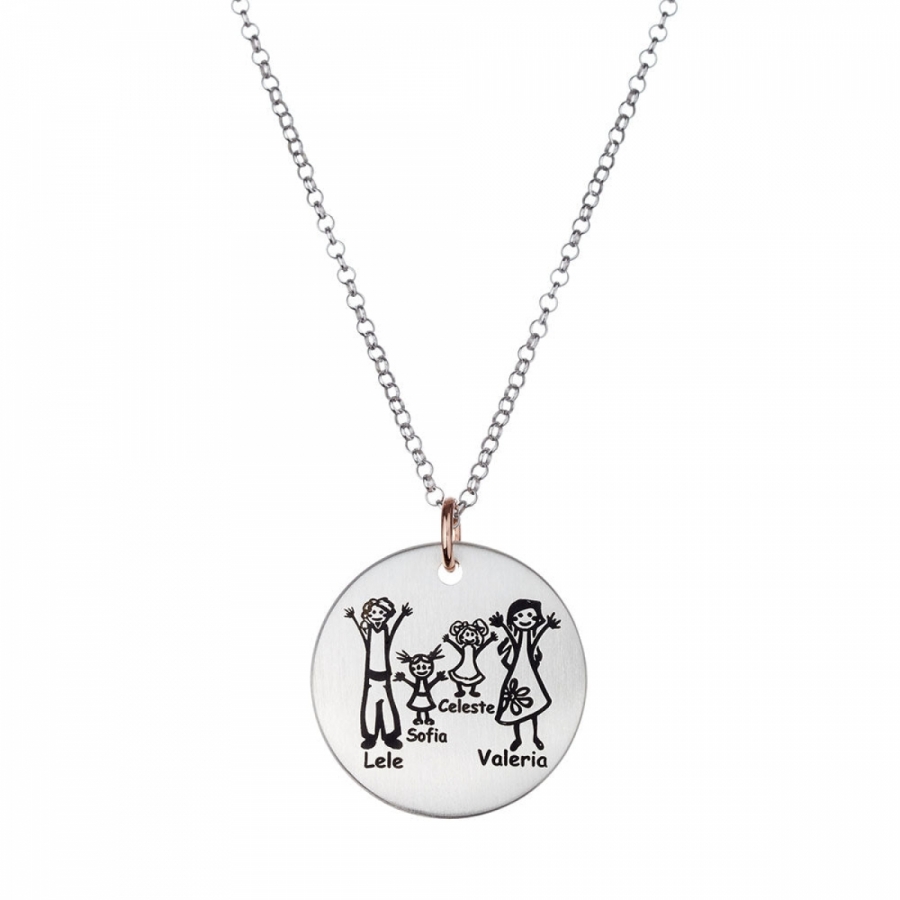 Medaglia media Happy Family in argento 925% e oro rosa 9kt personalizzabile con i componenti ed i nomi della tua famiglia, completa di collana lunga 50 cm oppure 70 cm.