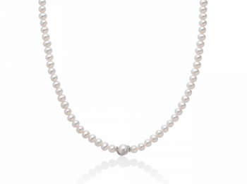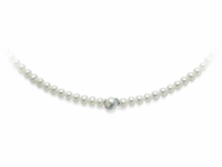 Collana di perle firmata Miluna con chiusura in oro bianco 18kt. Il centrale della collana è composta da una perla bianca di diametro 7-7,5 mm, avvolta in una fantasia di oro bianco 18kt. Le altre perle invece hanno un diametro di 5-5,5 mm.
