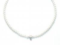 Il centrale della collana è composto da un ciondolo in oro bianco 18kt con incastonati 16 diamanti taglio brillante ed una perla bianca di diametro 8,5-9 mm.