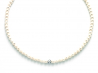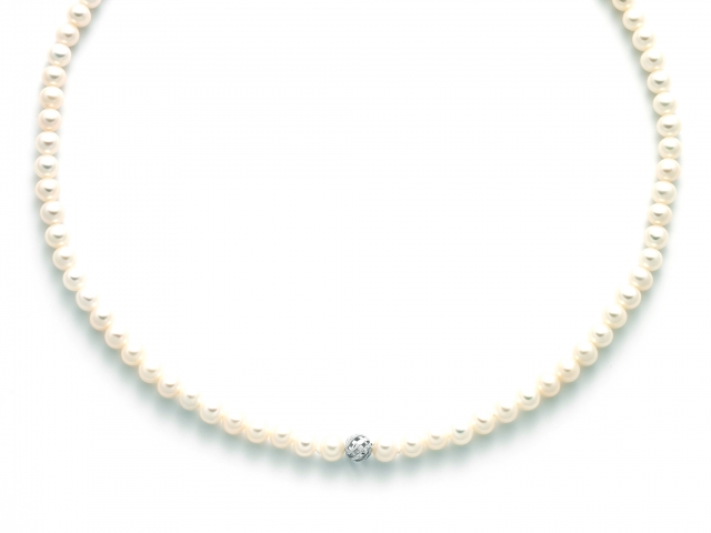 La collana è composta da una serie di Perle Naturali con diametro 5,5-6 mm ed una sfera centrale in oro bianco 18kt traforata.