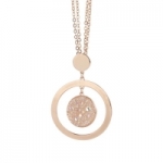 Collana BOCCADAMO doppio filo in bronzo placcato oro rosa con pendente concentrico (diametro cm 4, altezza cm 5,5) composto da cerchio interno in superficie Swarovski galuchat aurora boreale. Lunghezza cm 38, estendibile fino a cm 43,5.