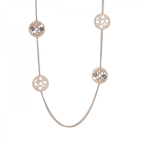 Collana BOCCADAMO lunga doppio filo in bronzo placcto oro rosa con elementi decorativi circolari, alternati ad altri con decoro in cristalli Swarovski crystal, peach e silver night. Lunghezza cm 85.