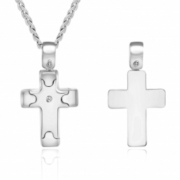 Il pendente Croce è lucido e satinato sulle punte, con al centro incastonato un diamante naturale taglio brillante. Il retro è invece completamente lucido e può eventualmente essere inciso gratuitamente con un nome o una data. Il tutto completamente in oro 18kt.