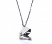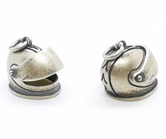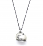 Particolare e rifinito pendente a forma di casco da motociclista, con visiera apribile, realizzato in argento 925% brunito e completo di collana lunga 50 cm con possibilità di allungarla fino a 55 cm.