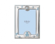 Cornice Le Bebè Portafoto rettangolare in argento bilaminato di misura interna 10x15 con sagome bimbo, quadrifoglio e tartaruga smaltati color azzurro in rilievo.