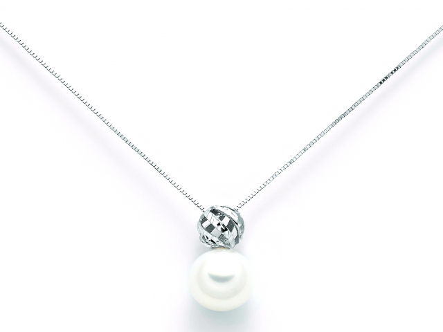 La catenina girocollo è composta da una sfera in oro bianco 18kt traforata e diamantata ed una Perla naturale dal diametro di 8,5-9 mm.