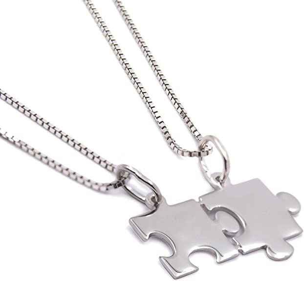 2 Catenine con ciondolo Puzzle spezzato divisibile in argento 925% rodiato e incisione fronte/retro