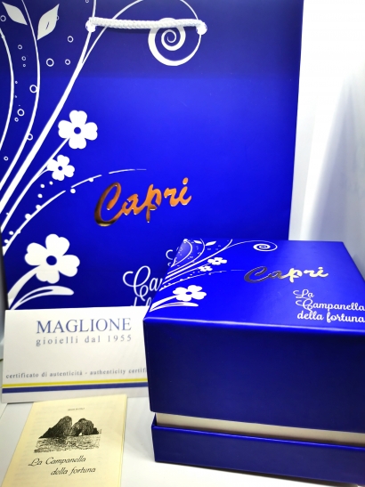 La famosa Campanella di Capri, un gioiello porta fortuna, realizzata interamente in argento 925% placcato oro giallo 18kt, con un rivestimento in VERO CORALLO (in foto sia il fronte sia il retro della Campanella).