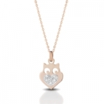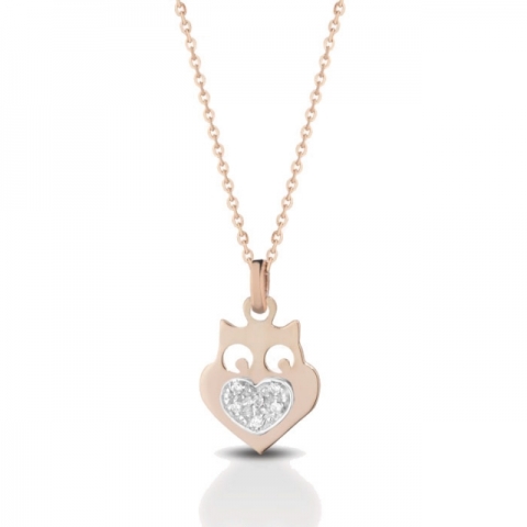 Catenina con ciondolo gufetto Melissa Jewels in oro rosa 18kt e pavè diamanti incastonati nel cuore, realizzato in oro bianco 18kt. Si prega di selezionare la preferenza del colore della catenina (oro bianco oppure oro rosa) nel menù a tendina, sopra al pulsante "Aggiungi al carrello". Se si desidera la personalizzazione gratuita del ciondolo (esclusivamente realizzata sul retro), si prega di comunicare il nome da incidere nel campo "Richieste? Personalizzazioni?" presente nel carrello d'acquisto. Gioiello Made in Italy accompagnato da garanzia e confezione regalo originale Melissa Jewels!