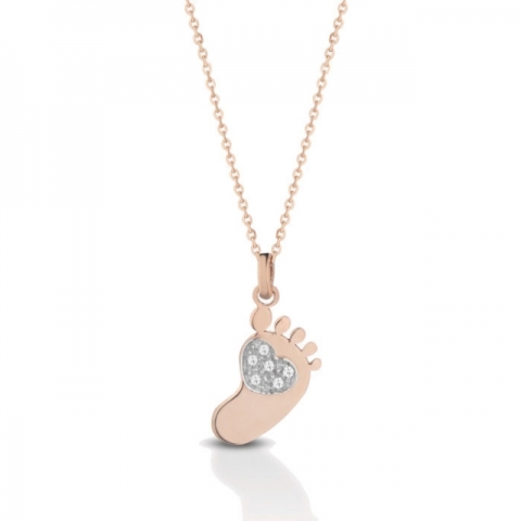 Catenina con ciondolo piedino baby Melissa Jewels in oro rosa 18kt e pavè diamanti incastonati nel cuore, realizzato in oro bianco 18kt. Si prega di selezionare la preferenza del colore della catenina (oro bianco oppure oro rosa) nel menù a tendina, sopra al pulsante "Aggiungi al carrello". Se si desidera la personalizzazione gratuita del ciondolo (esclusivamente realizzata sul retro), si prega di comunicare il nome da incidere nel campo "Richieste? Personalizzazioni?" presente nel carrello d'acquisto. Gioiello Made in Italy accompagnato da garanzia e confezione regalo originale Melissa Jewels!