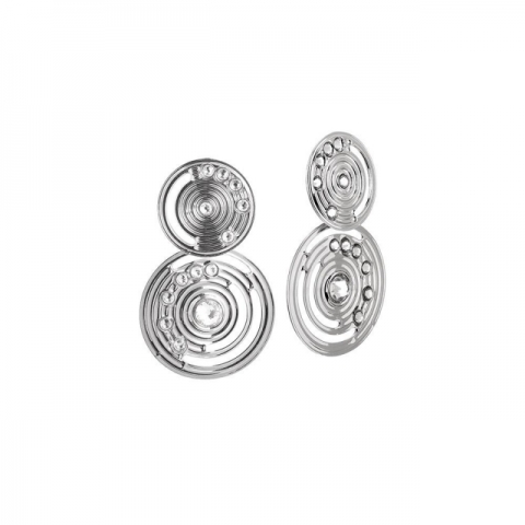 Orecchini BOCCADAMO in bronzo rodiato dal perno a farfalla, con pendente concentrico (diametro cm 2,5) dal disegno di ispirazione Maya e cristalli Swarovski crystal. Lunghezza cm 4.