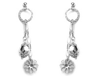 Simpatici orecchini pendenti realizzati in oro bianco 18kt. Al cerchio superiore sono agganciati due fili in oro sotto i quali troviamo dei simpatici pendenti, sempre in oro bianco 18kt. La chiusura è del tipo a pressione, detta anche a "farfallina". Gioiello Made in Italy con confezione regalo inclusa.