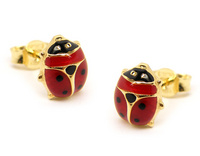 Simpatici orecchini a forma di coccinella smaltata a fuoco, del tipo che non va via, realizzati in oro giallo 18kt. La chiusura è del tipo a pressione, detta anche a "farfallina". Gioiello Made in Italy completo di confezione regalo e certificato di garanzia.