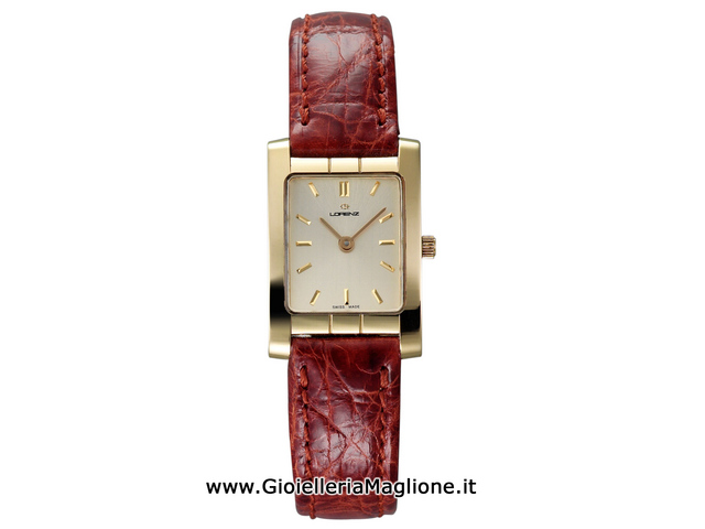 Lorenz, design italiano e tradizione orologiaia svizzera. Scheda tecnica: *Cassa quadrata in oro 18kt; *Fondo, con logo inciso, serrato con 4 viti e resistente all’acqua; *Vetro Zaffiro antigraffio; *Quadrante champagne; *Cinturino in pelle di coccodrillo. Completo di confezione regalo, shopper originale Lorenz e garanzia ufficiale di 3 anni.