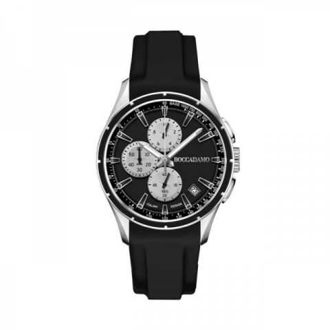 Orologio Boccadamo Uomo serie Aggresive Cronografo in silicone nero con quadrante nero, contatori silver ed ardiglione in acciaio. Scheda tecnica: - Corona e fondello: serrati a vite - Cassa: acciaio - Larghezza cinturino: 22 mm silicone - Lunghezza cinturino: 22,5 cm - Diametro cassa: 41 mm - Vetro: minerale. - Movimento: cronografo al quarzo VD57 - Impermeabilità: 5 atmosfere Orologio Boccadamo completo di astuccio, libretto di istruzioni e certificato di garanzia valida 2 anni presso qualsiasi centro assistenza autorizzato.